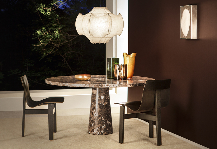 Eine Serie von Marmortischen, das Ergebnis der Forschung im Bereich von Möbeln, die auf dem Prinzip der “Aussparung” bzw. „Einlassung“ funktionieren und ohne Verbindungselemente oder Schrauben auskommen. Die konstruktive Idee von Eros besteht in der schwerkraftbasierten Verbindung zwischen Tischplatte und Fuß, ermöglicht durch die konisch angeschnittenen Bereiche der Beine, die es erlauben, die Tischplatte in einer definierten Position zu fixieren, wobei das eingesetzte Material die Verbindung extrem stabil macht und die Stabilität der gesamten Konstruktion ausmacht. Es handelt sich um ein System, das unterschiedliche Formen vorsieht, jede mit ihrer eigenen Einlassungs-Technik. Das elegante Design der Aussparungen entlang der Ränder und Kanten stammt daher, dass die fragileren Teile, die nicht so einfach Belastungen widerstehen, entfernt wurden – ein raffiniertes Detail und unverwechselbarer Bestandteil dieses authentischen Ausdrucks strukturellen Erfindergeistes.