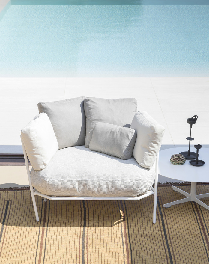 Die Outdoor-Einrichtungen der Kollektion Dehors wurden um ein neues, elegantes Finish bereichert. Die Version mit Stahlgestell und der Oberflächenbeschichtung aus gaufriertem, mattem Pulverlack ist ab sofort außer in Weiß auch in Braun erhältlich. Die Kollektion Dehors, die für die Gestaltung eines authentischen „Salons im Garten" konzipiert ist, inspiriert sich passend zum Thema an der Natur und der unregelmäßigen Form von Pflanzen. Vor allem die Trägerstrukturen weichen von den gewohnten Vertikalen ab, gewährleisten jedoch durch gegenseitiges Abstützen dennoch ein solides Gleichgewicht. Das Ergebnis ist eine bewegte Struktur, die sich von jeder architektonischen Regel befreit und gleichzeitig eine unerwartete Bequemlichkeit bietet. Dehors schafft so eine Architektur naturalistischer Inspiration und führt eine neue, dynamische Logik des Komforts ein. Die großzügigen, asymmetrischen Sitzflächen laden zu unzähligen Sitzpositionen ein, von der diszipliniertesten bis zur entspanntesten. Dehors ist ein kombinierbares System bestehend aus einem Sessel, einem Sofa und einer Chaiselongue. Die drei Einrichtungsgegenstände lassen sich in jedes Außenambiente harmonisch einbinden und schaffen eine Atmosphäre der Entspannung und Eleganz. Alle Kissen der Serie Dehors sind dank einer sorgfältigen Auswahl der Polstermaterialien und Bezüge sehr witterungsbeständig. Die Bezüge aus 100% UV-beständigem Akrylgewebe sind in Graubraun, einem warmen Hellgrau sowie in Weiß erhältlich und können für die Sitzflächen und Lehnen frei kombiniert werden.