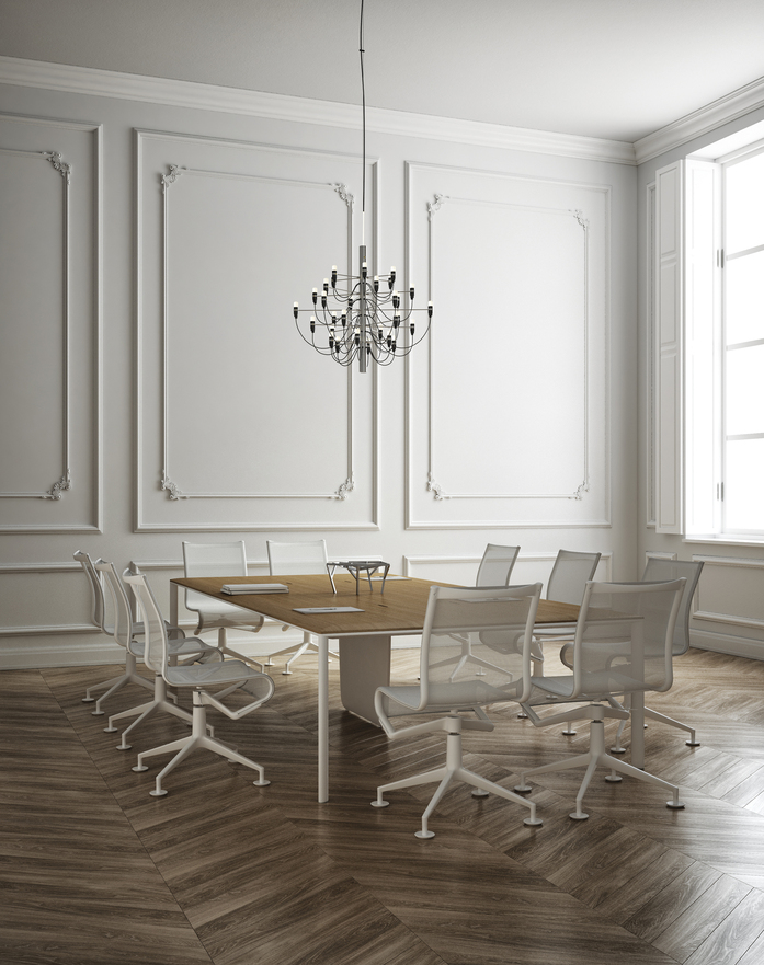 landscape erfüllt die Ansprüche von Direktionsbüros und Konferenzräumen und bietet leichte Tische im perfekten Stil von Alias. Es ermöglicht die Konfiguration unterschiedlichster Arbeitsbereiche durch schalldämmende Paneele, die einfach in die Tischfläche eingesetzt werden, und bietet eine Kabelöffnung und eine Kabelhülse.