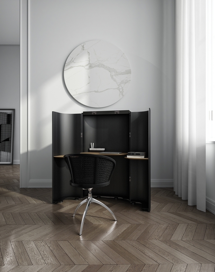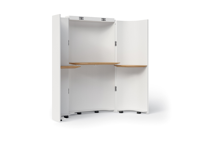 Das modulare System layout wird erweitert um neue Elemente aus Strangpressaluminium, die an dem ovalen Element von Sockel und Top befestigt werden und so eine tragende Struktur schaffen, an der Türen und Einlegeböden montiert werden können. Das Ergebnis ist ein Sekretär, ein reines, elementares Volumen mit einer Schreibtischfläche und zwei direkt an den Türen befestigten Auflageflächen. Mithilfe einer einfachen Bewegung öffnet sich dieses abstrakte Möbel wie eine Blume und offenbart einen Arbeitsbereich in seinem Innern. So wird es zu einem wichtigen Stück Büroarchitektur innerhalb der Architektur des Zimmers.