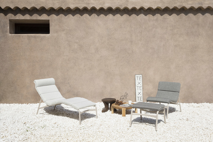 Chaise longue mit Gestell aus fließgepresstem Aluminium und Aluminiumdruckgusselementen. Sitz und Rückenlehne aus Camira® oder Kvadrat® Stoff oder aus Leder Pelle Frau®. Gespanntes Kevlar-Kabel schwarz.