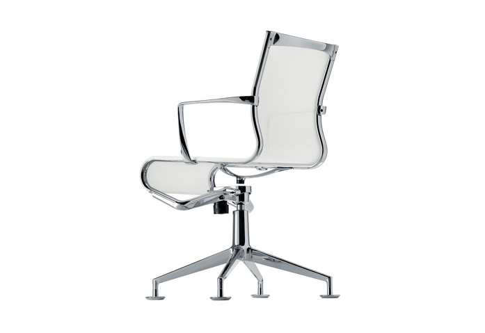 Drehbarer Stuhl mit Rückholmechanik, mit Armlehnen und Kippmechanismus auf 4-Sternausleger mit Gleitern. Sitz und Rückenlehne aus fließgepresstem Aluminium und Aluminiumdruckgußelementen. Bezug aus feuerhemmedem PVC-beschichtetem Polyesternetzgewebe oder aus Camira® oder Kvadrat® Stoff oder aus Leder Pelle Frau®.