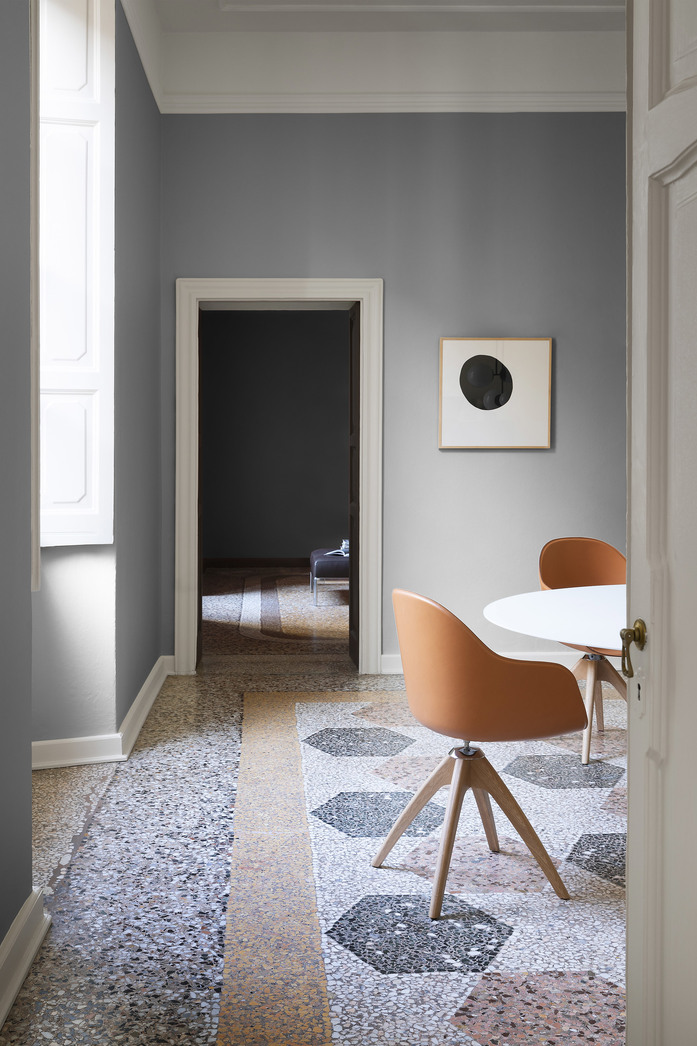 Die Sitzschale wird vervollständigt durch einen dreiteiligen Drehfuß aus Druckgussaluminium mit einem sichtbaren Federungsmechanismus oder in der neuen Ausführung mit Stuhlbeinen aus massivem Eichenholz.