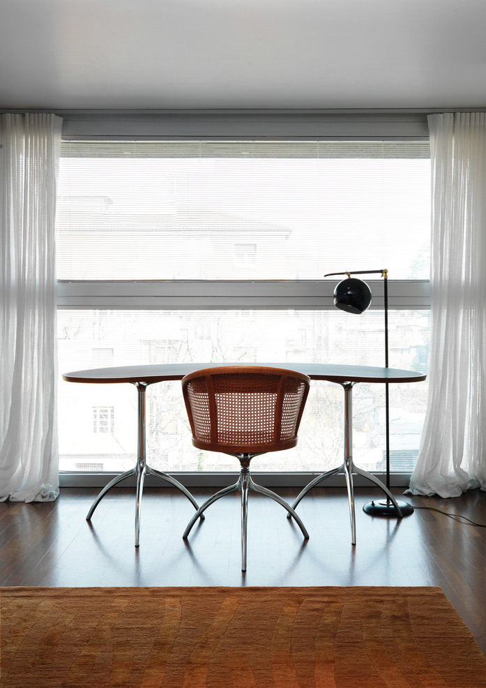 Die dreibeinige Struktur, aus Aluminiumdruckguss, liefert die tragende Idee dieser Kollektion die sich auch auszeichnet für die Varianten der Werkstoffe ihrer Sitze: Woenergeflecht, aus verschiedenen Holzarten, oder aus "Panno" Stoff in verschiedenen Fraben oder aus Leder bzw. Kernleder. Alle diese Qualitäten, von der Ästhetik und von der Funktion her betrachtet, machen jedes einzelne Stück geradezu ideal für die unterschiedlichsten Gebrauchssituationen, für das Büro zu Hause oder für den Contract. Die gleiche Struktur bildet auch den Fuss für die Rechtecktische und für die kleinen Rundtische, mit Tischplatte aus Holzarten oder aus Kristall.