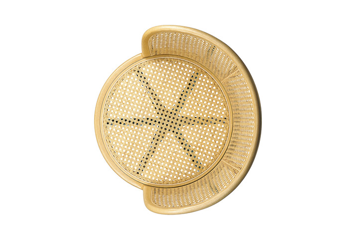 Der Entwurf des Sessels vereint in sich zwei nur scheinbar formal unterschiedliche Teile: das Drehgestell mit drei Beinen aus leichtem Aluminiumdruckguss mit sichtbarem Dämpfungsmechanismus und den einhüllenden Korpus aus Wiener Geflecht, das über einen massiven, heiß gebogenen und verarbeiteten Buchenholzrahmen gespannt ist.