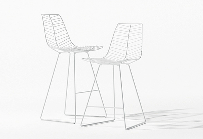 Hocker aus Rundstahl, mit Kufengestell, lackierte Ausführung ist in drei Farben erhältlich: weiß, grün und Mokka. Auf Anfrage sind Gleiter für Holzfußböden erhältlich.