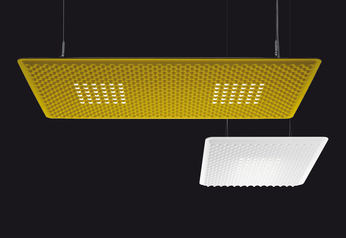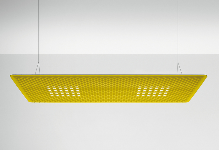 EggBoard verbindet die akustische und strahlende Effizienz mit einer systemischen Philosophie: das Aufhängen mehrerer Leuchten in unterschiedlichen Höhen und verschiedenen Farben, ermöglicht nicht nur die Leistung dem Raum anzupassen, sondern lässt durch seine architektonischen und leuchtenden Effekten wahre spektakuläre Kompositionen entstehen.
