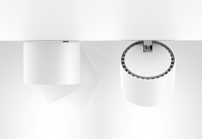 Hoy ist ein Leuchtsystem an verstellbaren Spots von elementarer Form, aber reich an Performance. Ein einfacher Zylinder ragt je nach Modell in verschiedenen Höhen aus der Oberfläche (Einbau, Semi-Einbau, SMD). Ihr Umfang teilt sich, um die Lichtemission im Raum auszurichten. Der bewegliche Teil umschließt Lichtquelle und Lichtleiter, um vier verschiedene Öffnungen des Lichtstrahls zu modellieren (23 °, 35 °, 53 °, 70 °).