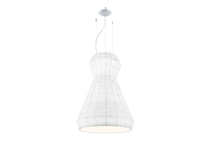 Leuchtenkollektion von Hängeleuchten, Metallstruktur bezogen mit einem schwer entflammbaren Pongé-Stoffband. Zehn verschiedene Farbvariationen: dunkelgrau, hellgrau, orange, grün, goldgelb, elektrisches blau, rot, bordeauxrot, weiß, warmweiß, ziegelfarben, braun und zwei bunte Ausführungen. Insgesamt sechs modulare Schirme mit Durchmessern von 93 bis zu 150 cm und Länge von bis zu 300 cm. Lichtquelle: Halogen- oder Fluoreszenzleuchtmittel mit E27-Sockel.