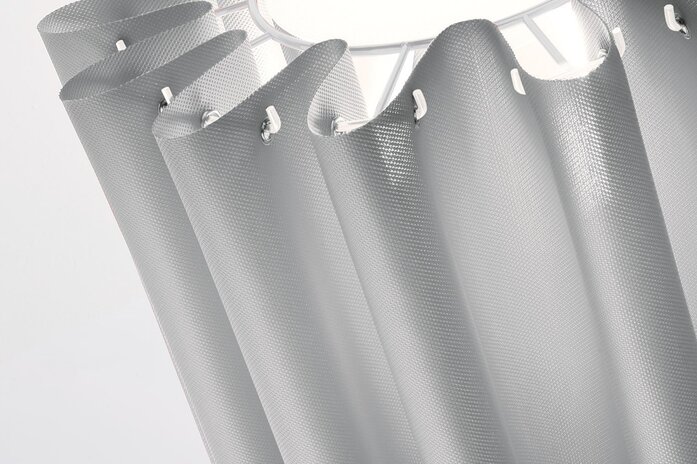 Leuchtenkollektion, mit Lampenschirm aus einem hängenden Stoff, zweilagiger, feuerfester TREVIRA® CS-Stoff. Außen netzförmig schwarz und innen, nach Wahl, in folgenden Farbtönen: orange, rot, pinkfarben, dunkelbraun, blau, hellblau, hellgrün, hellgrau, neutralweiß. Auch als farbiger, einlagiger Stoff, ohne schwarzes Netz erhältlich. Umfangreiche Auswahl Produkten mit bis zu 150 cm Durchmesser. Lichtquelle: Fluoreszenz- oder Halogenleuchtmittel, letztere auch in Kombination mit zusätzlichen RGB LED für große Hängeleuchten.