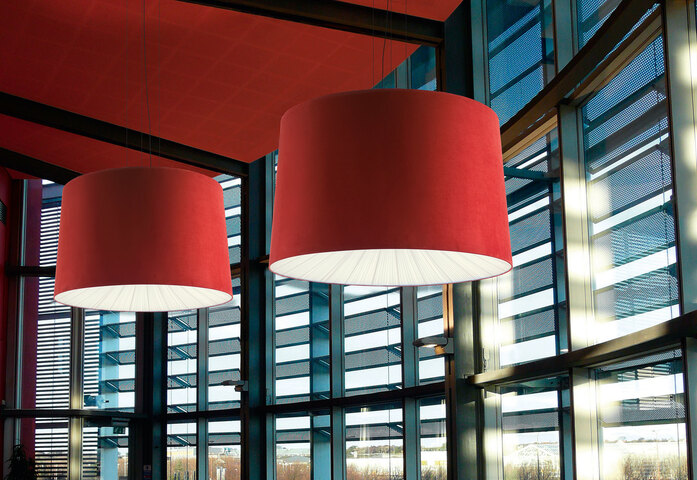 Hänge-, Decken-, Wandund Bodenleuchten-Kollektion mit Lampenschirm aus schwer entflammbaren, veloursartigem Micro 2000– Stoff. Acht verschiedenen Farben: elfenbeinfarben, braun, orange, bordeauxrot, hellblau, blau, eisfarben, schwarz. Lampenschirme zwischen 50 cm und 160 cm Durchmesser. Strahlenförmiger Diffusor aus Pongè-Stoff mit unterschiedlichen Farbtönen. Lichtquelle: Halogen- oder Fluoreszenzleuchtmittel.