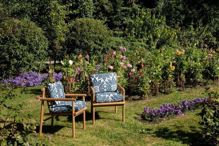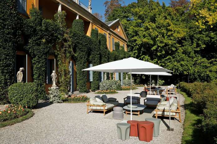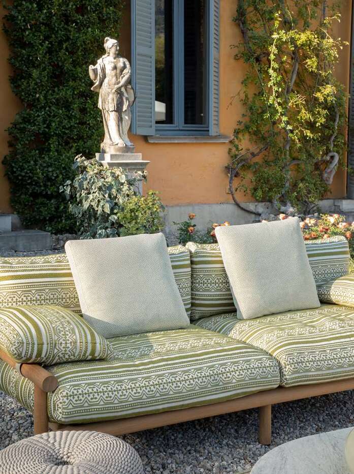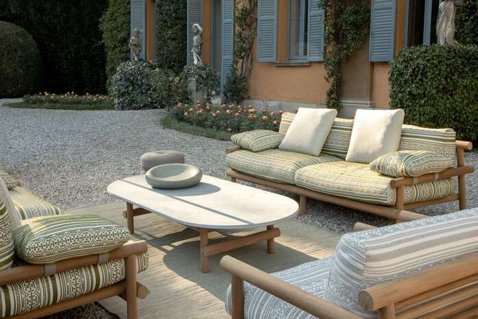 Minimalist and innovative, the Ayana collection becomes a new chapter in the story that connects B&B Italia to Naoto Fukasawa. It sees wood as the protagonist, interpreted in an unusual way, witha pleasant oriental touch. If the depths and heights are a clear reference to the south-east Asian tradition, the backrest recalls a Swedish wall bar, an exercise equipment turned into a load-bearing element. Thanks to this solution, the elements of the Ayana collection can be enjoyed and appreciated at 360 degrees, discovering on each side a new elegant interplay of intersections and proportions. Two and three seat sofas and the armchair have armrests at different heights. The armchair armrest is higher to guarantee a more ergonomic seat. The sofa armrest, which is lower, can be combined with a cushion that is easy to be fastened and removed, and helps to lie down more comfortably if necessary. The upholstery of this collection stands out for the individual cushions, all covered with waterproof fabrics. Ayana’s warm minimalism is completed with a chair, a dining table and a low table. The dining chair recalls the stylistic features of the other seats, for a perfect family feeling, with the structure in natural teak wood and two generously padded cushions covered in fabric. The table stands out for its oval top in serpentine, a typical stone of the Alps. The supporting structure in natural teak appears light but is extremely robust, able to resist weather and support the heavy top. Even the coffee table has a round section structure in natural teak, with a top in serpentine. Its broad dimensions allow to create a pleasant convivial atmosphere in outdoor settings. Ayana is a project with a green soul. The teak used to make the structures is FSC certified (Forest Stewardship Council) and all the materials that make up the various elements of the series, at the end of the product’s life cycle, can be separated and disposed of with respect for the environment.