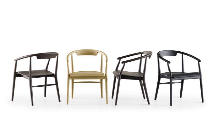 Antonio Citterio interprets the classic design of Chinese chairs in a contemporary key, rediscovering the craftsmanship of turned and curved wood, added to leather to make seats and backs that enhance the design. For the Jens chair, designed by Antonio Citterio with arms in two versions and without arms, the choice of natural oak and wengé offers two shade variants.