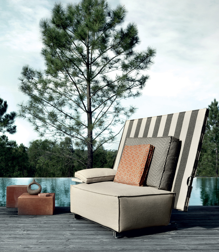 The very first collaboration between B&B Italia and Philippe Starck leads to the birth of a sofa and an armchair, both with impressive dimensions and a highly scenographic presence, that surprisingly combine an unusual shape and an unexpected function, with a name that really attracts attention. Oh, it rains! is a piece of considerable impact, destined to last over time and to be talked about, but also to be used in the most unexpected ways and contexts. Philippe Starck started his research for this project by going back to the origins of outdoor furniture, that of nomads and soldiers: desert tents and field equipment, colonial colors and very light materials, essential shapes with functions connected with rapid action. We notice Oh, it rains! right away for its large backrest. It isn’t a simple decorative element, though. It acts like a wall or a partition to create an intimate and private setting, and, when necessary, it folds down on top of the seat and - voilà - the seat and cushions are covered and protected. Colours and materials go hand in hand with the initial concept and the collection introduces colonial shades and raffia-effect waterproof fabrics. The backrest is proposed as a surface to be personalized through the choice and combination of fabrics. The collection is enhanced by optional cushions that guarantee extra comfort and a dynamic look to this large object, suitable for private settings and also for outdoor areas in hotels and lounge. From a technical standpoint, the backrest is made with a double layer of water-repellent fabric, which makes it 100% waterproof. For this reason Oh, it rains! can be covered with any type of outdoor fabric present in the B&B Italia collection. It is also possible to choose the version with a side table integrated into the structure, available in natural teak wood or Mediterranean stone.