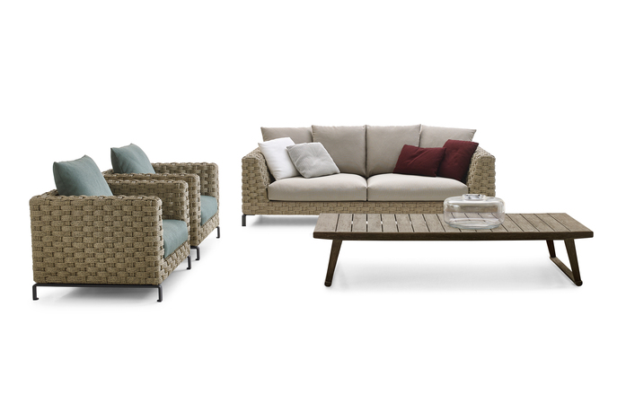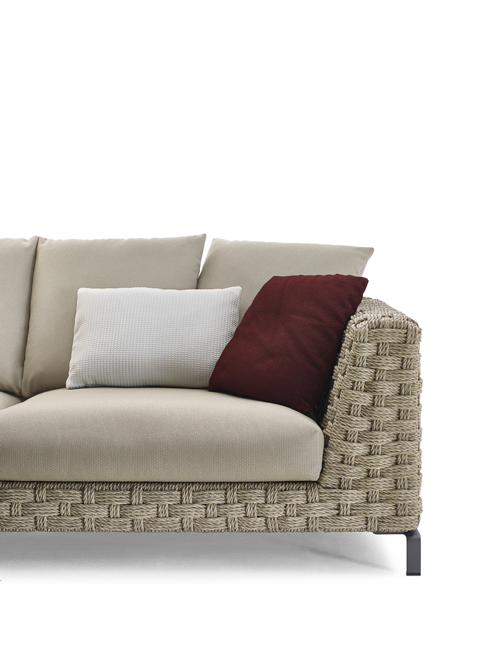 After the success of the indoor series, the Ray seating system by Antonio Citterio equips itself for outdoor use with two new seating versions, Natural and Fabric. They have in common a light extruded aluminium frame and are distinguished by different interlacing details and materials. Ray Outdoor Natural features a “rope” weave inspired by natural Abaca to perfectly merge with nature. It uses textilene, a material that is perfectly suited for outdoor settings. Ray Outdoor Fabric presents a “ribbon” weave made of polypropylene fibre - material resistant to both UV rays and atmospheric agents - in colours that range from turquoise to blue, from acid green to dove grey, and bright bordeaux. Both versions include sofas in two depths and modular elements - from terminal elements to chaise longue - and armchairs. The sunbed with wheels is foreseen only in the Fabric version.The seats are completed by seat and back cushions that make them particularly welcoming and comfortable, besides offering exclusive chromatic combinations.