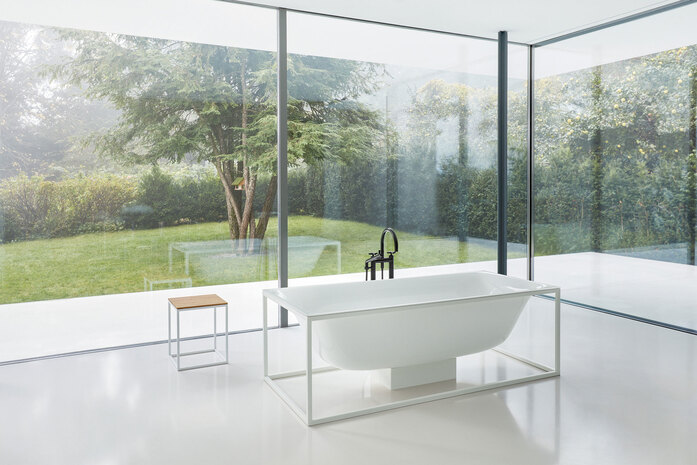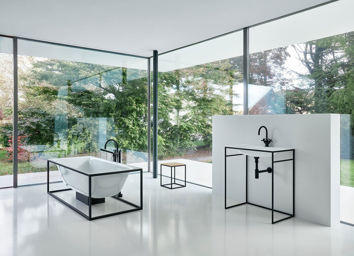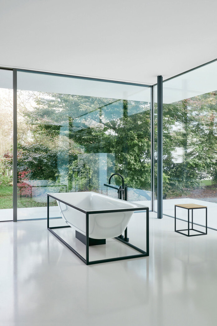 Rahmen aus pulverbeschichtetem Stahl halten die Badewannen und Waschtische der Linie BetteLux Shape wie schwerelos im Raum. Sie bringen die ganze Schönheit der organischen Wannenform zur Geltung. Ein speziell entwickelter unsichtbarer Überlauf und aufwendige Details wie präzise Wannenecken, die bündig mit den Gestellkanten abschließen, unterstreichen die Idee der perfekten Reduktion.