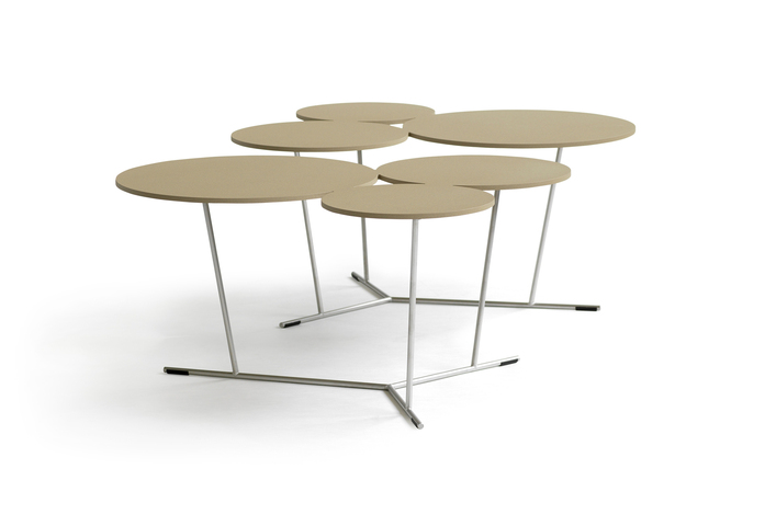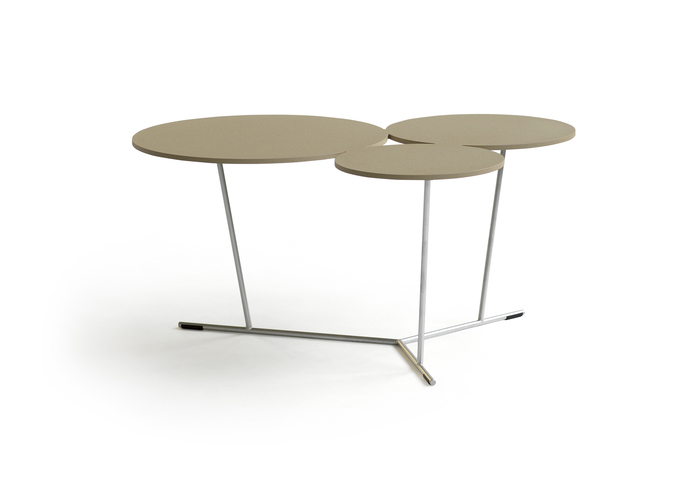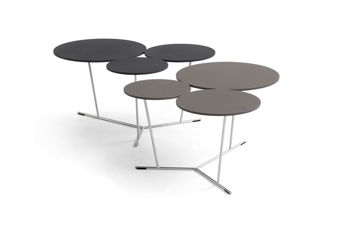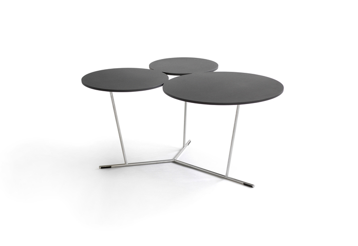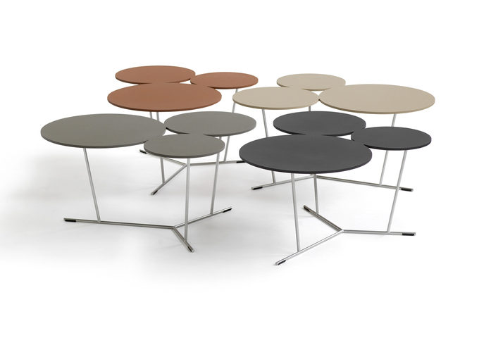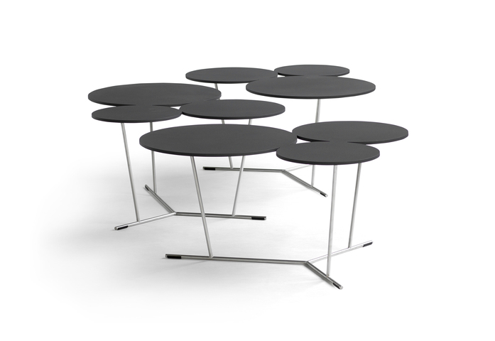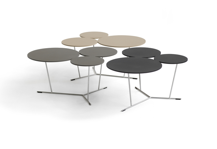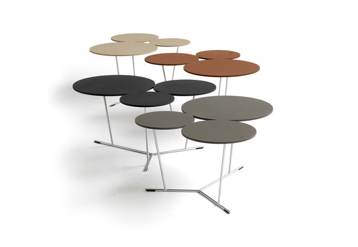 Bubbles’s playful shapes break up strict and square environments. A decorative graphic table with three different sized stylised bubbles. They can be adjusted if you simply want more. They bubble over into the room. The matte lacquered table-top comes in laser-cut aluminium and is supported by a stainless steel structure. Available in many colours from Black and white to sand, terracotta, anthracite and clay. Can be used indoors as well as outdoors.