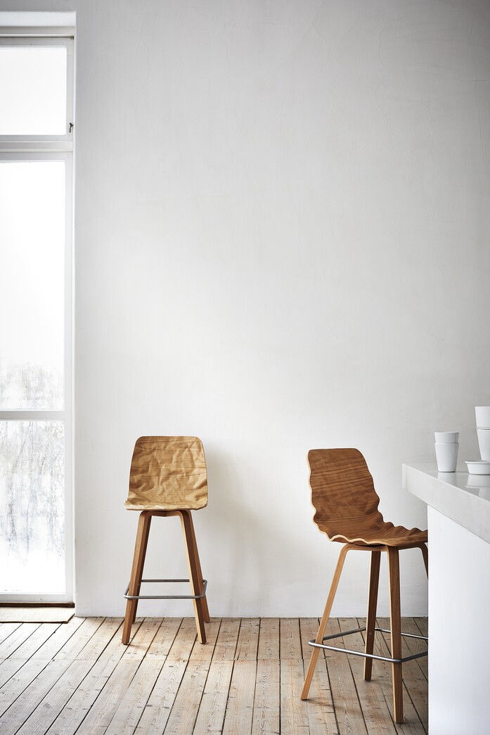 Dent adds a human touch to contemporary clean and overly strict architecture, while questioning the modernist heritage where the straight and meticulously polished are the norm. “Dent’s uncontrolled flow of shapes offers a contrast to interior spaces that are often experienced as being way too perfect. Even the architecture comes alive in the presence of Dent.” At first glance, Dent might appear uncomfortable, but the curving shape is well adapted to the human body where it really counts. This upholstered version is available in fabric or leather with a classic swivel frame base. The original Dent is also available with or without ”dressed” seat shells as chairs and bar chairs, all with a choice of frames in steel or wood.