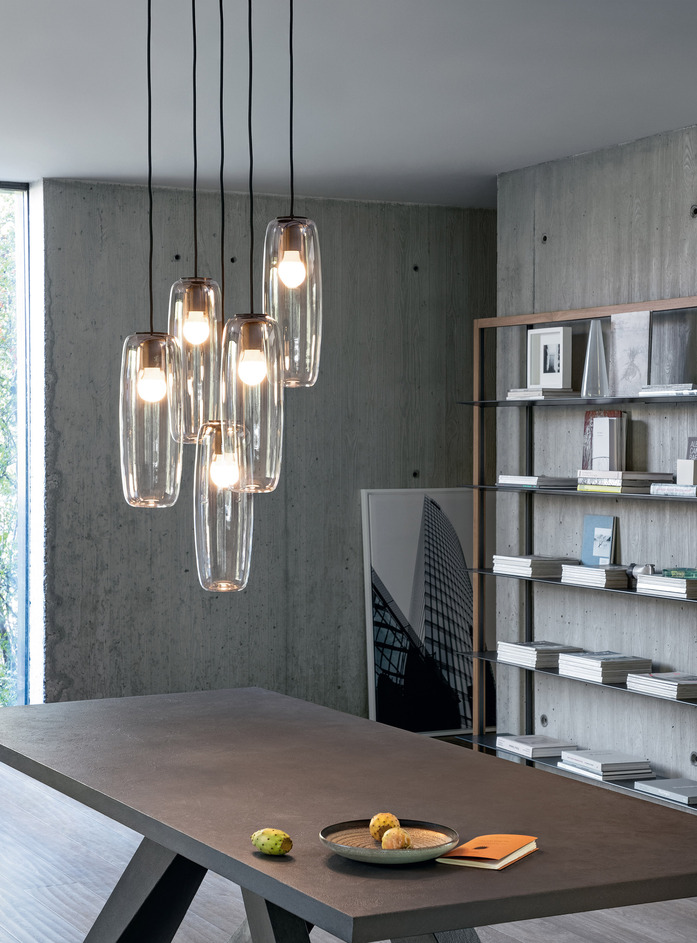 Kontraste, ein Spiel mit Reflexen und eine starke plastische Präsenz kennzeichnen die Leuchtenkollektion Bio-s. Die Kollektion, bestehend aus drei verschiedenen Hängeleuchten und einer Stehleuchte ist Ausdruck von Dreidimensionalität und Perspektive, ein Ort, wo entgegengesetzte Elemente aufeinandertreffen. Bei der Stehleuchte umschließt eine architektonische Metallstruktur das edle geblasene Glas des Lampenschirms. Bio-s besticht durch ein eindrucksvolles Design, das von dem Lampenschirm - in transparentem Glas oder in der Ausführung Fumé verspiegelt erhältlich - zusätzlich unterstrichen wird.
