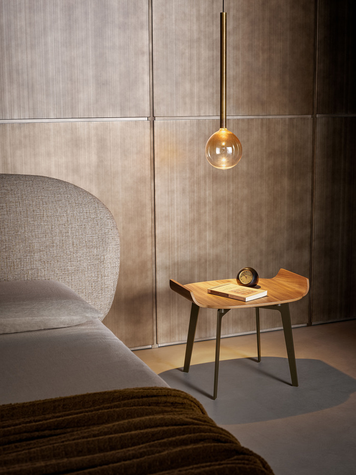 Der Nachttisch Olos greift die zeitgemäße Eleganz und Reinheit der Formen auf, die auch die anderen Elemente der Kollektion auszeichnen. Das geschwungene Holz in seiner formalen Schlichtheit macht die Auflagefläche des Nachttisches edel und leicht. Getragen wird das Ganze von langgliedrigen Metallbeinen, die die Ablagefläche anheben und der Figur Schwung verleihen.