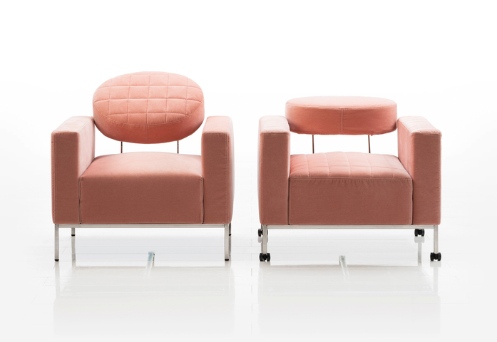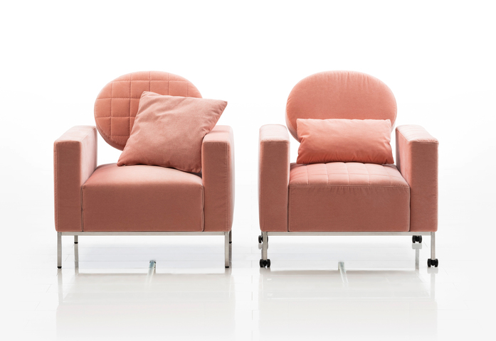 Schweben: Das biomorphe Oval der verstellbaren Rückenlehne von airy-coupé schwebt über dem Sesselkorpus aus Sitzbasis und Armlehnen. Die filigranen Bügel, die die Lehne halten und zugleich den funktionalen Kern von airy darstellen, fallen im Gesamtbild des Sessels kaum auf. Überraschende Effekte ergeben sich durch quadratische, rechteckige oder runde Zusatzkissen. Sie treten in einen Dialog zum Oval der Lehne und laden zu immer wieder neuem Spielen und Experimentieren mit Form, Farbe oder Textur ein. Zu ergänzen mit einem Hocker. Bezüge abziehbar.