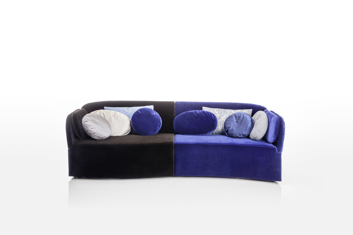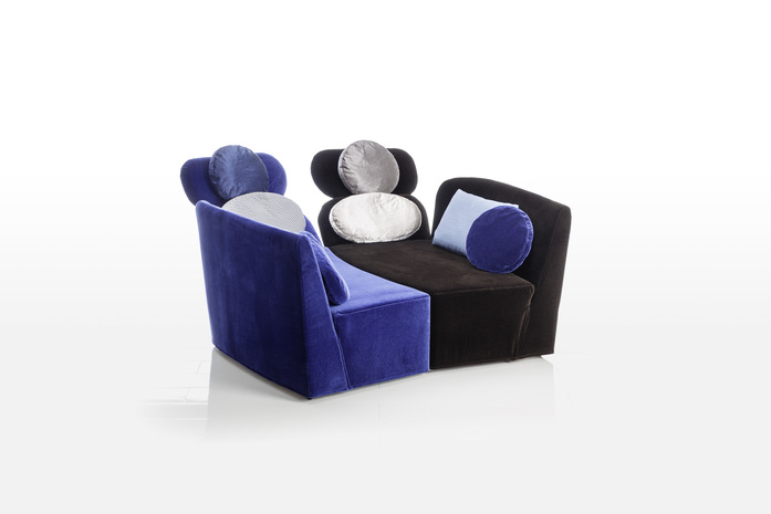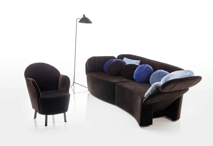 Zweiteiliges Verwandlungssofa floret glory, dessen Armlehnen sich auffalten und zur Seite neigen lassen. Beide Elemente zusammen bilden einen Lounge-Pool. Das Verwandlungssofa floret glory verläuft vorne in einer leichten S-Linie. Ein dekorativer wie auch funktionaler Akzent, durch diese Kontur ergeben sich unterschiedliche Sitztiefen. Diese Linie gibt auch dem Lounge-Pool eine weiche organische Ausstrahlung. In der Rückenansicht zeigen sich die grazilen gerundeten Konturen des zum Lounge-Pool geschlossenen Sofas floret glory.