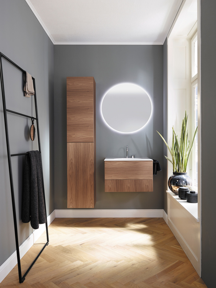 Coco ist ein charmanter Vermittler zwischen zwei Welten: Ruhig, klar und zurückgenommen. Aber auch individuell, hochgradig designorientiert und funktional. Hier bilden Möbel und Waschtisch eine beeindruckend filigrane Einheit, die zugleich ein herrliches geometrisches Spiel zwischen rund und eckig darstellt. Dazu Stauraumlösungen, die in vielen Formen die Einrichtungswünsche urbaner Trendsetter berücksichtigen. Genau wie praktische Innovationen: Die grifflosen Auszüge öffnen und schließen mit einer Kombination aus sanfter TipOn- und Soft-Close-Technik.