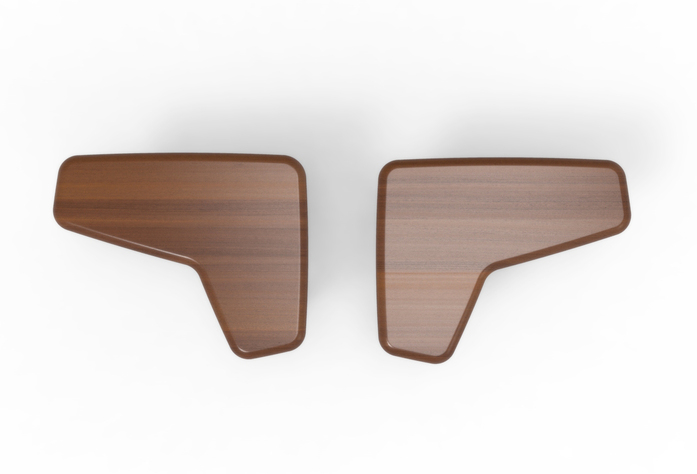 The shapes allow you to position the side table left or right next to your sofa. Highly functional for your evening tea, the daily newspaper or a table lamp. Finished off with a messing coated cross under the solid wood table top. The perfect setting for a Mad Men scene.