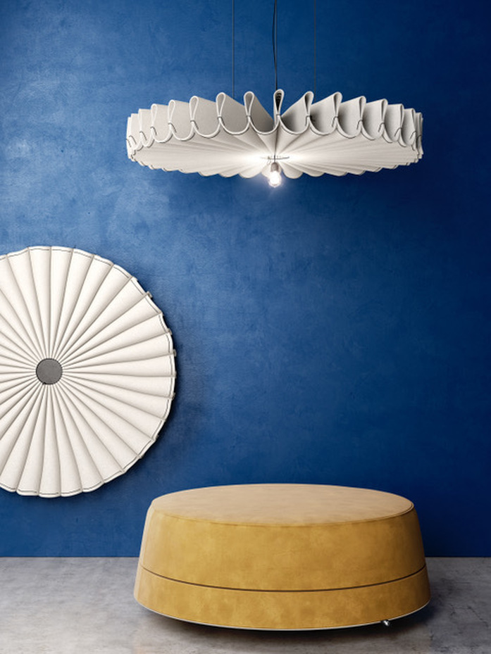The hanging acoustic pendants can be configured with an optional light source add-on, to marry sound control and illumination in one multipurpose product. The collection includes two configurations, BuzziPleat Ripple and BuzziPleat Edel, both can be can be affixed to the wall or suspended from the ceiling. Each model is available in two sizes. Choose from a diameter of 100cm or 150cm. Select one of many BuzziFelt and BuzziFabric combinations, ranging from neutral to bold and bright hues.