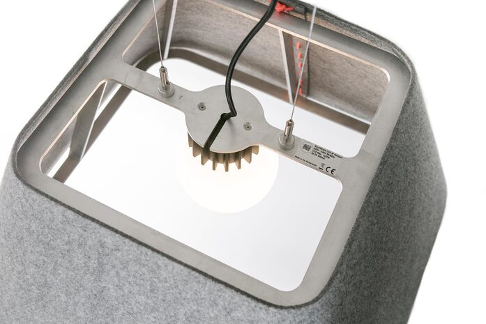Noise-reducing pendant lighting, with a twist. Meet BuzziShade Square, with its unique personality. It combines a nicely finished metal frame, upholstered in BuzziFelt, with our signature lacing available in a wide range of colors. This meticulously crafted lighting fixture, with acoustic capabilities, reduces external noise level to a maximum while blending in with the interior. It is such a versatile modern lighting that means the perfect addition to any office, lobby area or restaurant. Be adventurous and hang several BuzziShade Square in a row for an even more distinctive setting and wellbalanced space.