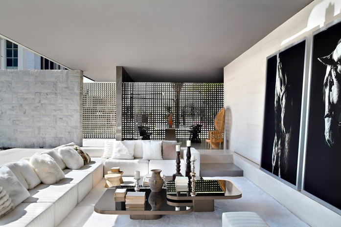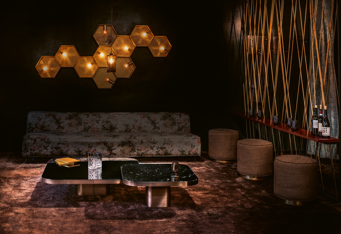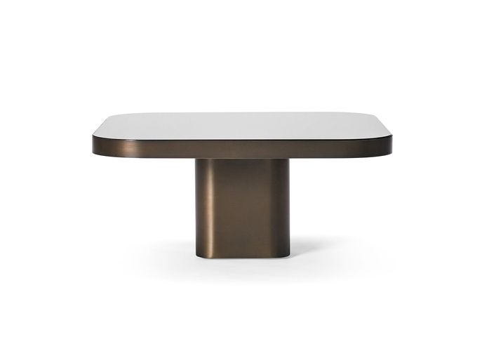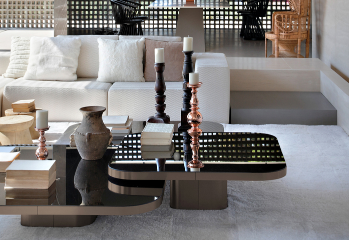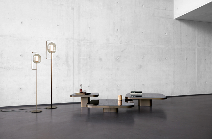 Inspiriert von der Linienführung der 70er Jahre stellt der Brasilianer Guilherme Torres einen Beistell- oder Couchtisch von lässiger Eleganz vor. Auch die mit Metall überzogene Oberfläche des Korpus zitiert futuristische Entwürfe dieser Zeit und ist trotzdem ein eindeutig aktueller Entwurf. Über einem Sockel mit gerundeten Ecken schwebt die mit Glas oder Marmor belegte Tischplatte. Die drei Größen sind so aufeinander abgestimmt, dass die Tische einzeln oder als Gruppe, auch mit einander überschneidenden Platten, wie eine dynamische Skulptur arrangiert werden können. Es entsteht eine großzügige Ablagefläche auf mehreren Ebenen.