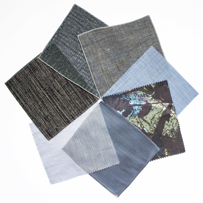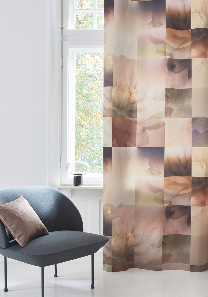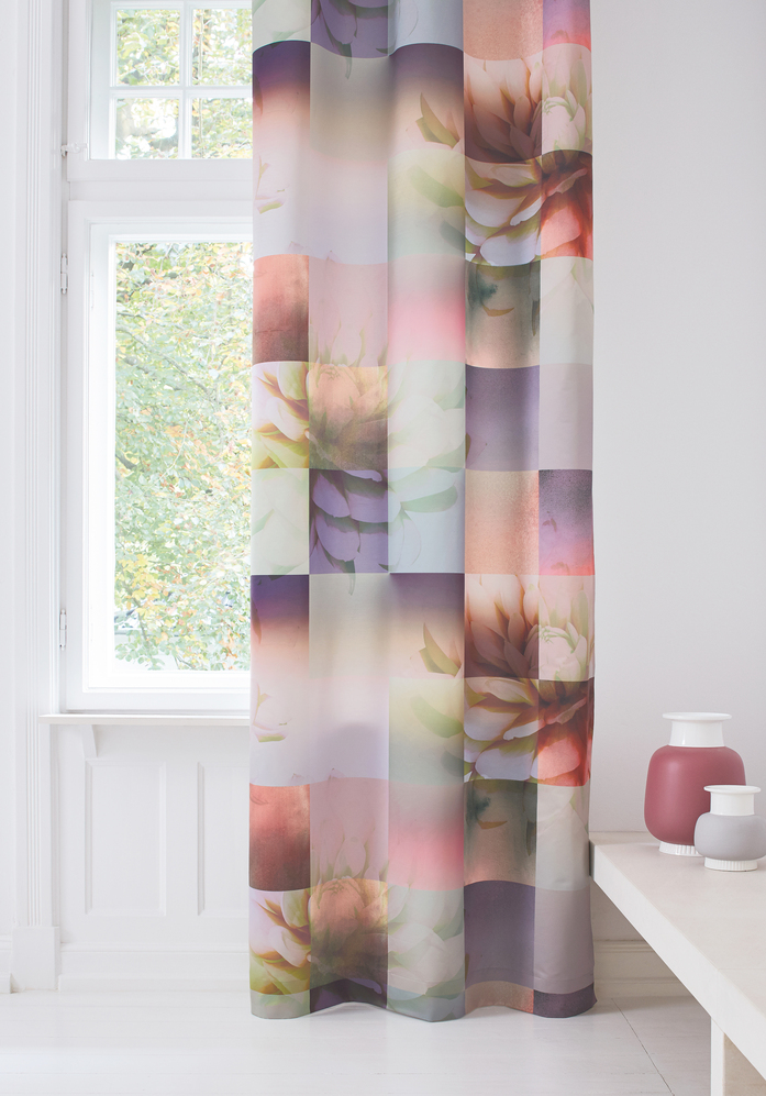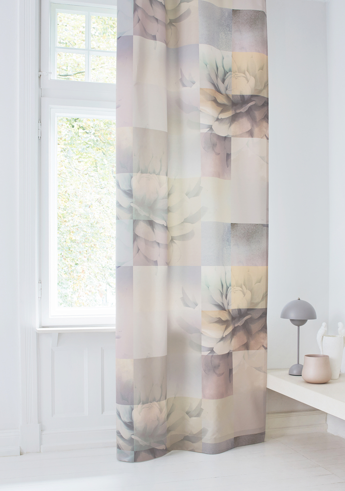 Dichter Vorhangstoff; Grosse Blüten steigen sachte durch ein quadratisches Raster. Ein abstraktes und nuancenreiches Spiel mit Farben und Formen entsteht, bei welchem die Übergänge unterschiedlich betont werden.