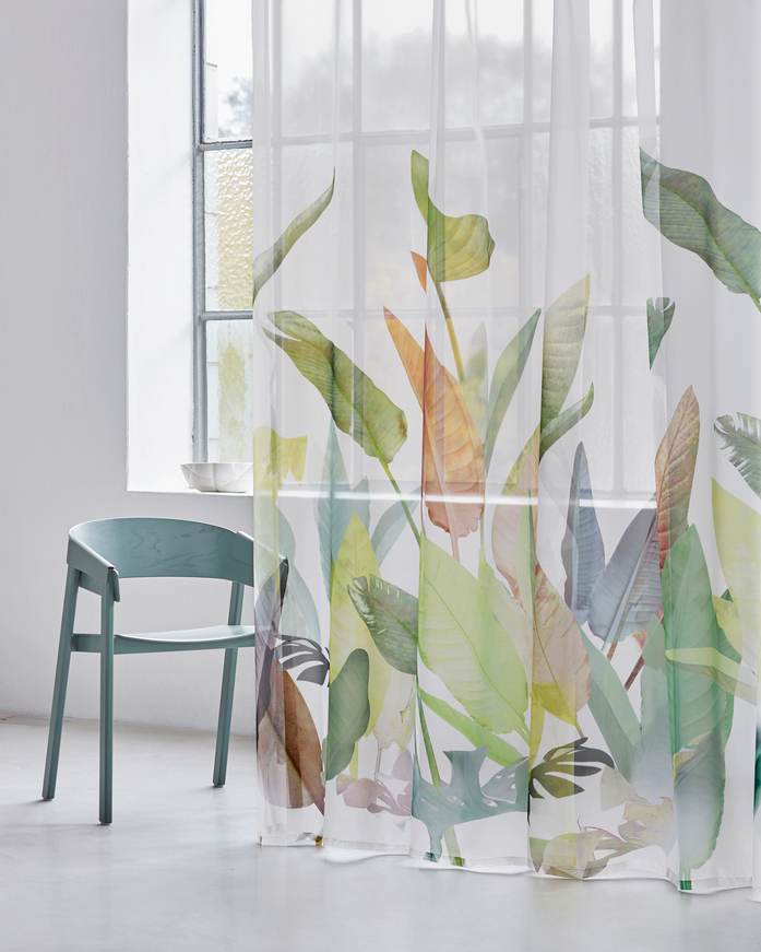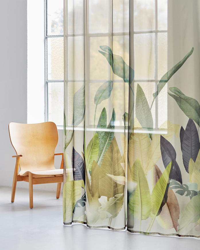 Transparenter Vorhangstoff mit grosszügigem, floralem Dessin. Der Digitaldruck zeigt überdimensionale Blätter und Pflanzen mit spannenden Strukturen in gedeckten, subtilen Farbtönen auf einer hochtransparenten Grundware in Trevira CS.