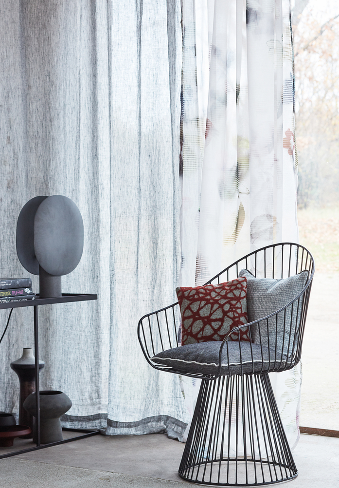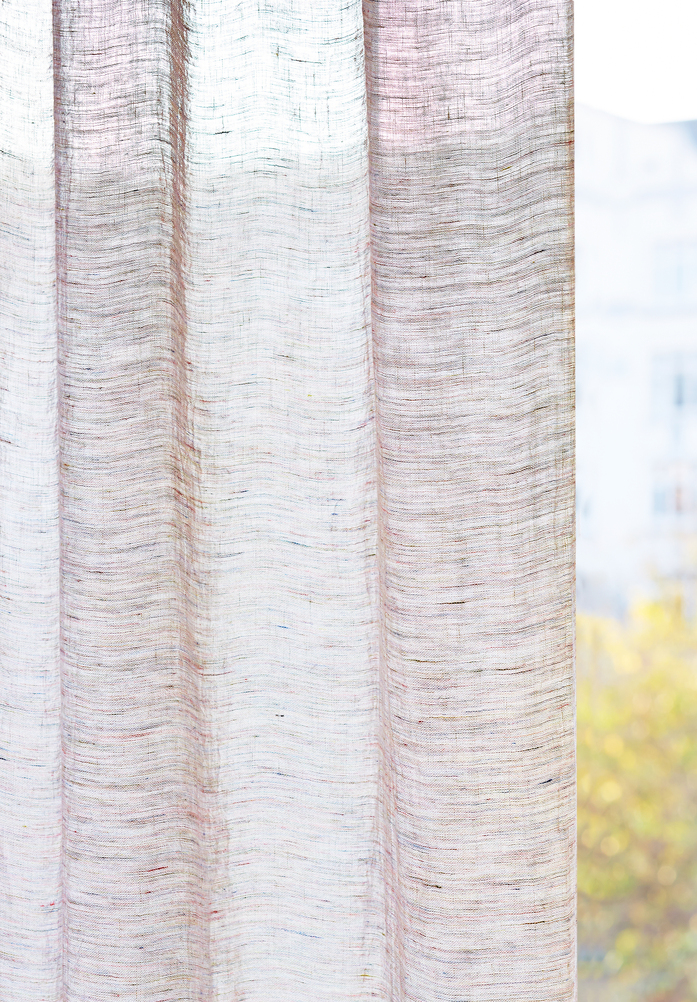 Halbtransparenter Vorhangstoff; Charaktervoller Leinenartikel mit legerem Ausdruck. Die Multicolorkette verbindet sich mit unifarbenem Schussgarn zu subtilen Farbverflechtungen. Die Klarheit der Farbe wird gebrochen und es entsteht eine erdige, natürliche Farbpalette ohne dabei schwer zu wirken.