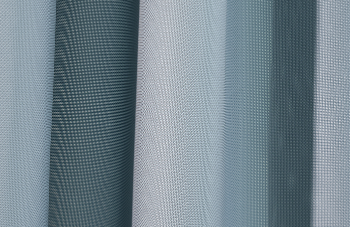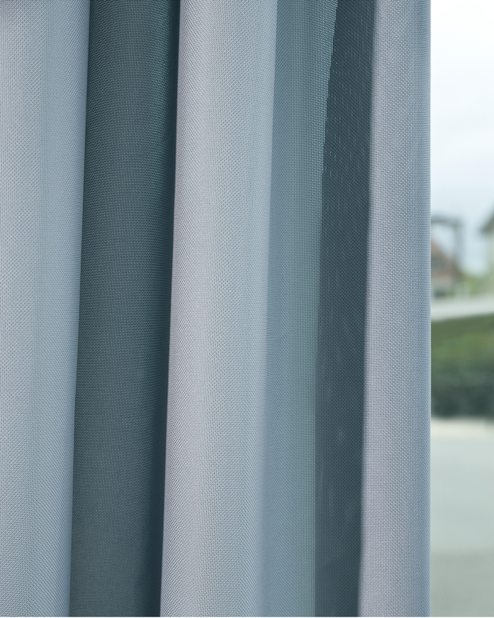 Halbtransparenter, flammhemmender Outdoorstoff; Der Objektvorhangstoff wurde speziell für die Anwendung als Sonnen- und Blendschutz im Aussenbereich entwickelt und ist durch seine flammhemmende Eigenschaft eine absolute Neuheit im Bereich der Outdoor-Textilien.