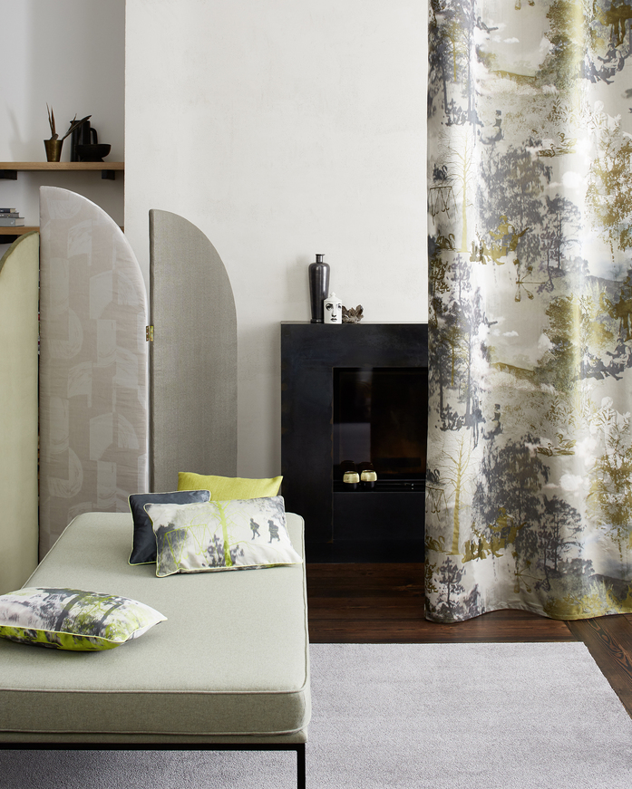 Dichter Vorhangstoff; Der extravagante Stories lädt ein, beim Betrachten Geschichten entstehen zu lassen. Das klassische Toile-de-Jouy Motiv wird mit leichter Ironie frisch und keck interpretiert. Hochwertige Kombination von unterschiedlichen Techniken: Das Dessin wird sowohl auf die Kette gedruckt als auch mittels Jacquard und Fil coupé eingewoben. Faszinierende Überlagerungen entstehen.
