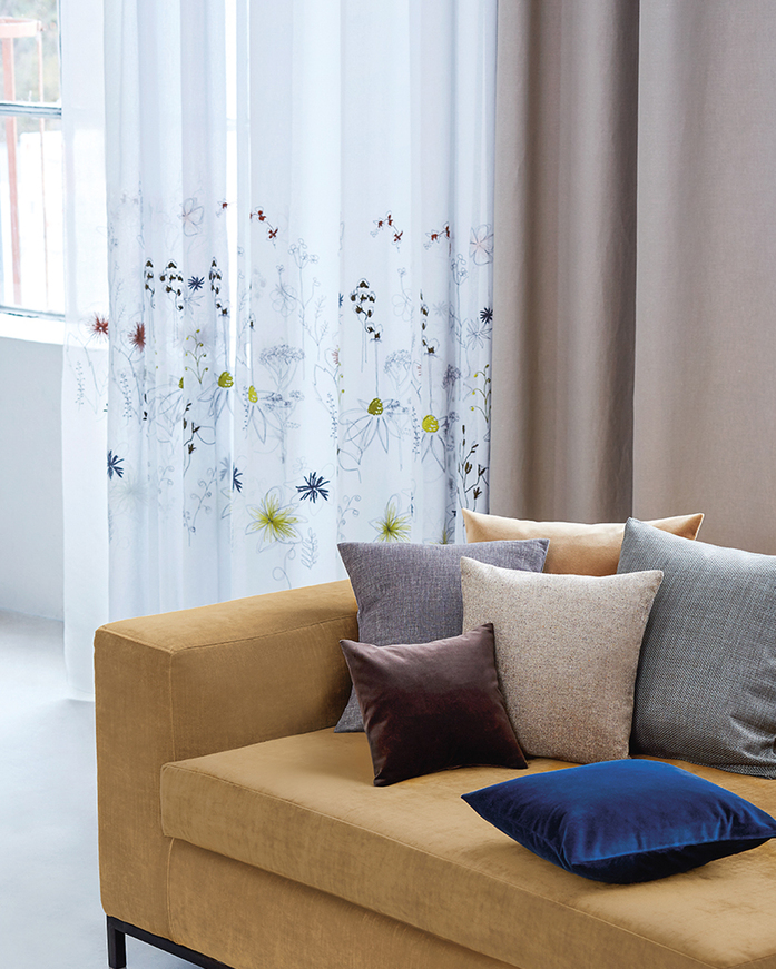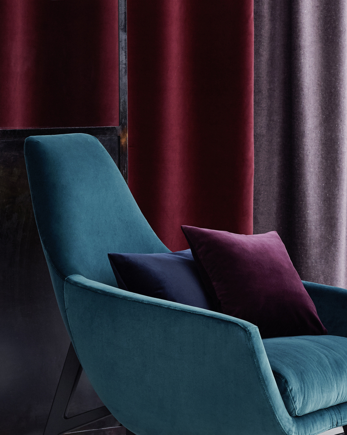 Möbelstoff; Der aparte Baumwollvelours tritt stilvoll in neuer Farbigkeit auf. Elegante, tiefe Blau- und Petrolnuancierungen sowie keckes Grün gesellen sich zu attraktiven Rottönen und werden edel flankiert von subtilem Pistache, Rosé und Mauve.