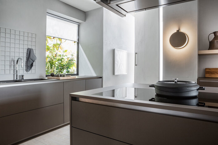 Ein einfaches, einheitliches, geradliniges Projekt. Hi-Line 6 ist mehr als eine Küche, sie ist ein Wohnraum. Rigorose Formen, vielfältige Details und sorgfältige Verarbeitungsqualität: Viel Technologie und präzise definierte Volumen. Ein mit esprit de géométrie organisierter Raum. Die Unterschränke sind höher gestaltet, um alles bestmöglich zu verstauen.