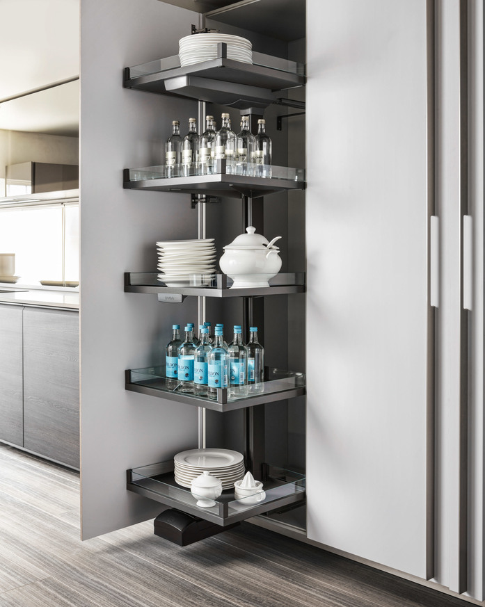 Dieser bietet neue Möglichkeiten für die Lagerung der Vorräte. Die hinteren Ablagen werden beim Öffnen der Tür zum Bediener gezogen. Rationale Vorteile und emotionale Eigenschaften machen den Vorratsschrank Tandem zu etwas Besonderem: Technische Präzision, elegante Bewegungen und hochglänzend verchromte Ausführungen. Tandem wurde für Möbel von 450, 600, 900 und 1200 mm Breite konzipiert.