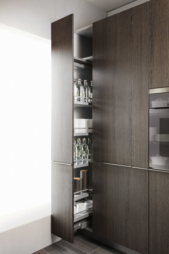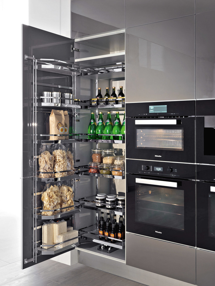 Perfekte Lagerung der Vorräte in nur 30/45cm Breite. Mit den individuell eingehängten und höhenverstellbaren Böden wird der Vorratsschrank zu einem flexiblen Raum. Die Breite und die gesamte Höhe des Hochschranks werden vollständig genutzt, ohne wertvollen Stauraum zu opfern. Dank der Böden mit Reling ist der gesamte Inhalt stets beidseitig einsehbar, auch bei den oberen Böden. Bis zu 100 kg können sacht aus dem Schrank gleiten. Die Schließbewegung, falls elektrifiziert, wird durch einen leichten Druck auf die Tür aktiviert.