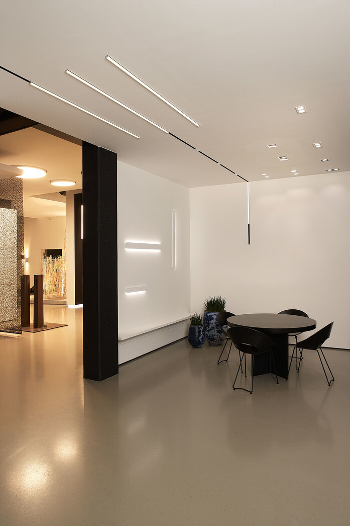Mit dem eleganten schwarzen Deckeneinbauprofil, dessen Breite sich nach der jeweiligen Anforderung des Raums richtet, startet eine neue Ära nahtloser, grafischer Lichtlinien und Lichtpfade. Sie stehen im engen Dialog mit der Architektur, denn funktional und gestalterisch lässt Splitline unterschiedlichste Interpretationen zu. Passende LED-Lineareinsätze können hinter einer bündig zum unteren Abschluss des Profils oder hinter einer in das Profil zurückversetzten Diffusorscheibe integriert werden. Neben dieser Lösung für die Allgemeinbeleuchtung lassen sich mit diversen Strahlern der „Spy-Familie“ lichttechnische und dekorative Akzente setzen. Ein häufiger Wechsel ist willkommen, denn die magnetisch ausgestatteten Leuchten werden einfach werkzeugfrei an jeder beliebigen Stelle des Profils positioniert.
