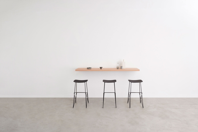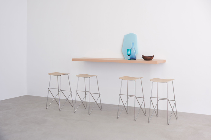 Stool with base in lacquered steel rod, or in the Desalto exclusive finishes. Lacquered MDF seat or oak veneered. The footrest is covered with a stainless steel profile, except for the chromed frame version.