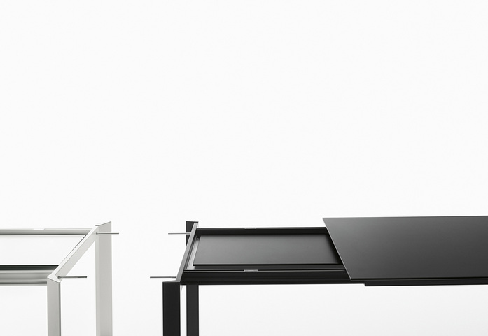 Extendible table with extruded aluminium structure and guides. Glass or Alucompact® tops available. Extensions in Alucompact®. Two extractable handles allow to easily extend the frame.