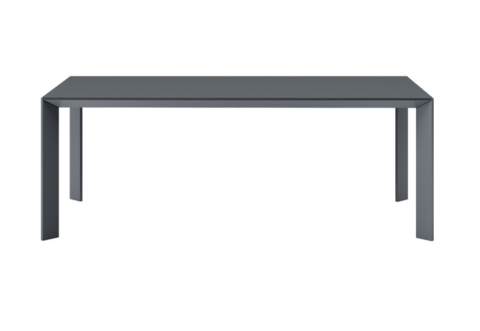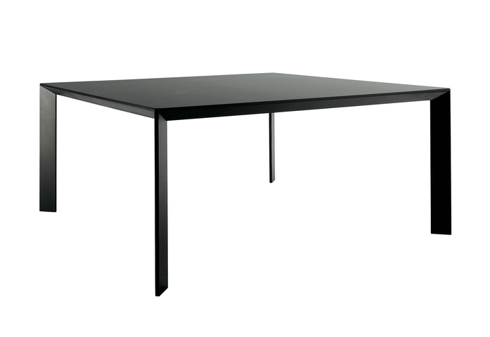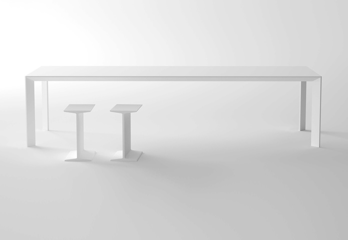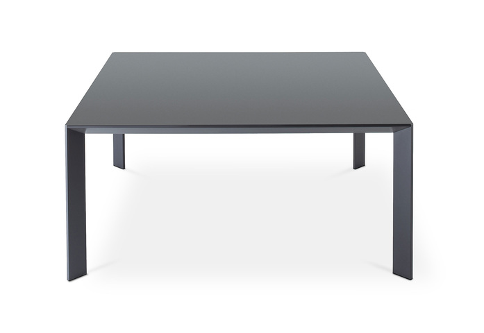 Table with extruded aluminium frame and die-cast structural joints. Built-in tops of 8 mm toughened glass, ceramic, laminate or wood. In some versions, it is suitable for outdoor use.