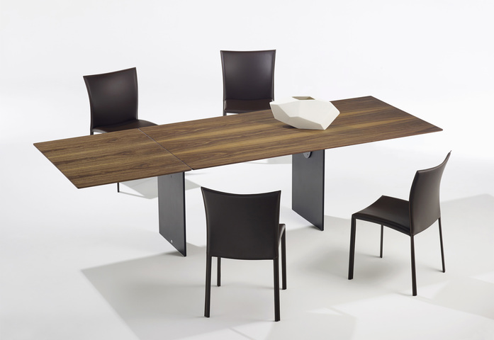 Dieser rechteckige Esstisch überzeugt durch seine moderne Strenge. Eine neu patentierte Technik lässt die unter dem Tisch integrierte Ausschwenkplatte spielerisch über ein Kugellauflager herausdrehen, wobei die Symmetrie zum Unterbau im ausgezogenen wie eingeschwenkten Zustand gegeben ist. Während dem Herausziehen der Erweiterungsplatte verschiebt sich die Hauptplatte über eine Gleitlagerführung spektakulär in Längsrichtung. Die Ausschwenkplatte wird dann an der Stirnseite des Tisches durch eine Federunterstützung angehoben, um diese auf die Höhe der Hauptplatte anzuheben. Der Tisch ist in verschiedenen Größen, mit oder ohne Auszug erhältlich in Stein, Massivholz sowie Naturholz. Es stehen 3 Sockelvarianten zur Verfügung.
