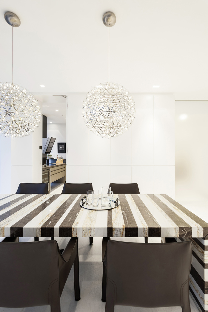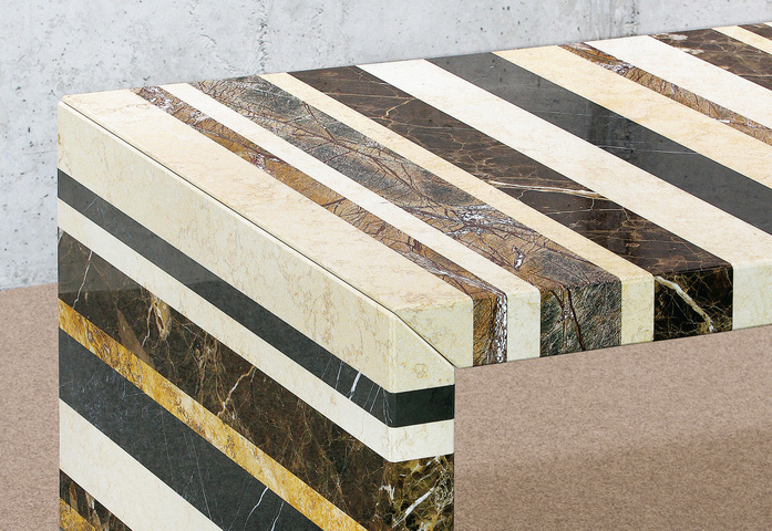 Seine Anmutung ist avantgardistisch, da er lediglich aus Steinfragmenten zu einem harmonischen Ganzen neu zusammengefügt wird. Der Barcode Table ist Esstisch und Konferenztisch gleichermaßen und durch den Einsatz von Stein und Stahl zu 100% recyclebar. Diese Komposition, ausgewählt aus 200 verschiedenen Steinsorten mit unter-schiedlichen Charakteristiken, bedarf großen Know-hows und wird von Meistern der Steinmetzkunst so zusammengefügt, geschliffen und poliert, bis der Tisch zu einem Objekt aus einem Guss wird. Durch die Verwendung von Steinen aus dem Produktions-prozess werden Ressourcen genutzt, die einen dauerhaften Umgang mit dem Material Naturstein sicherstellen und dieses Material auch für nachfolgende Generationen noch zugänglich machen. Jeder Barcode Table ist ein Unikat. Die individuelle Auswahl der Steinsorten ist naturgemäß limitiert und die Verfügbarkeit ist auf Anfrage zu prüfen.