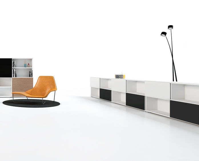 Several colour and shape combinations are possible with these bookshelves, through a variety of melamine and glass finished “sliding doors”. The mechanism includes a soft-closing devise and permits an easy assembly of the doors onto the rails.