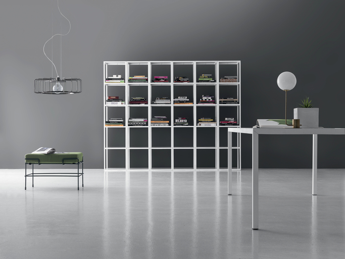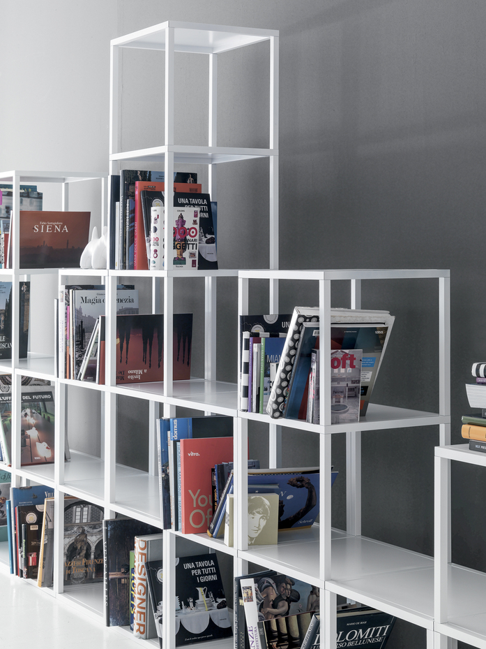 Metal bookcase with modules, available in different heights, in anthracite or white color. Made of squared aluminum tubes, connected by zamak joints. Light and minimal design, allows to create a contemporary and trendy solution ensuring maximum functionality.