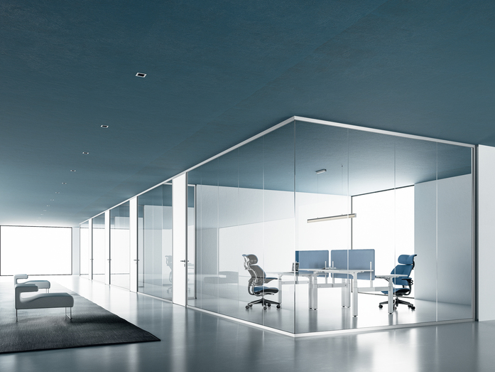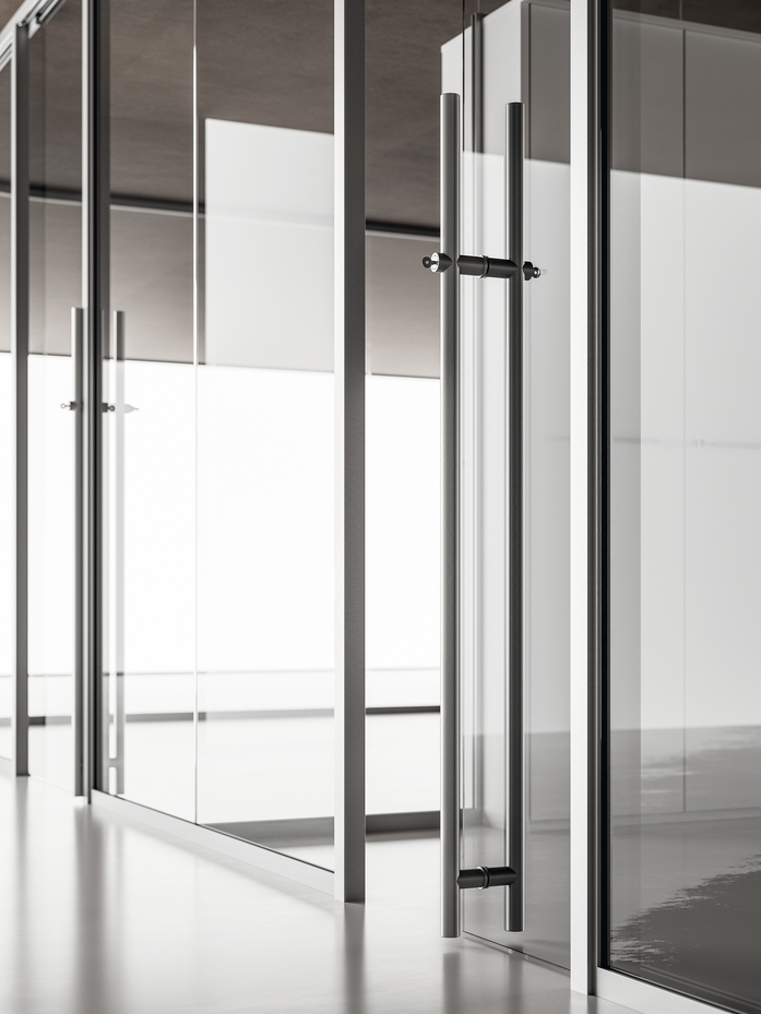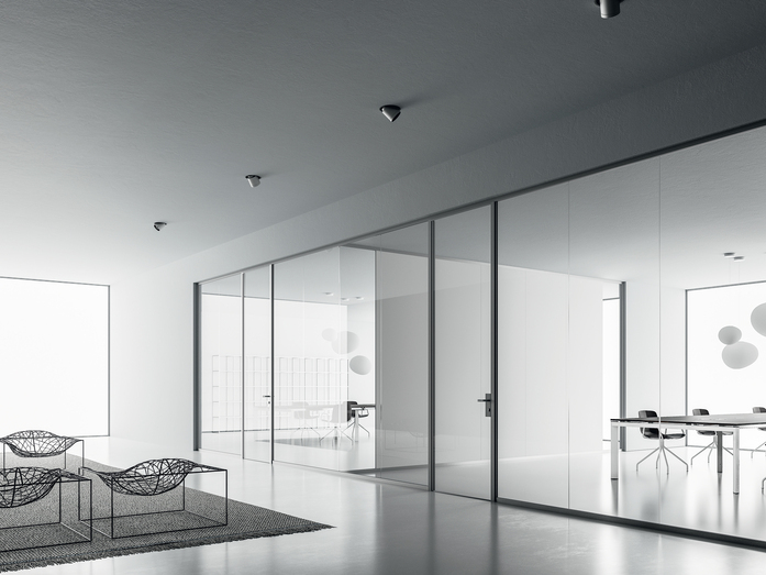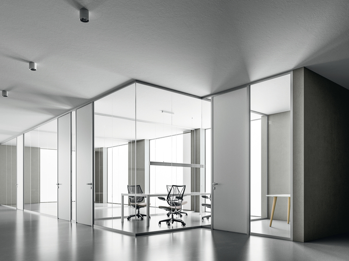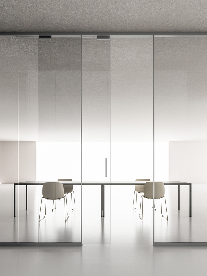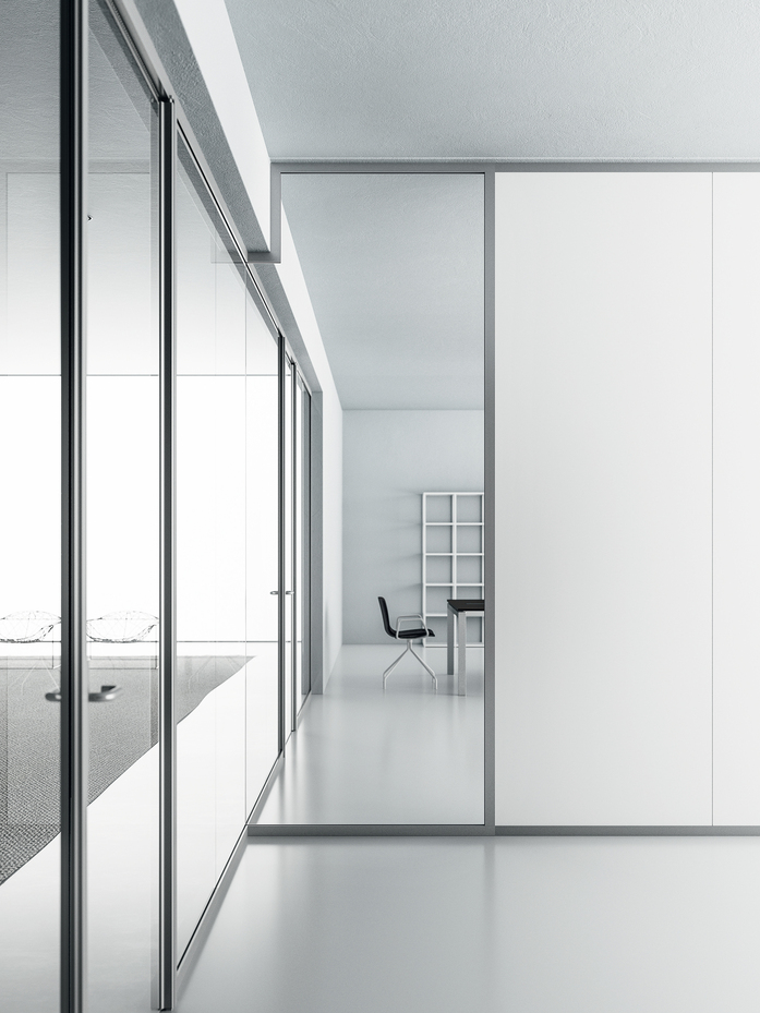 The DV602 series, a 3 cm thick single-glazed partition wall, emphasizes simplicity and technicality. The main features are: outer aluminium profiles, laminated glass sheets, melamine or veneer wooden panels, sliding or hinged doors and various modules.