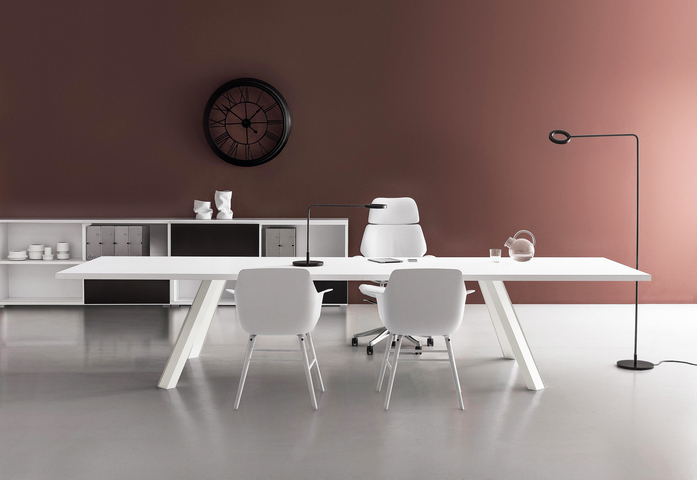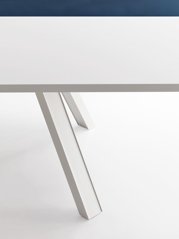 DV909, a series of tables with folding worktop in white or black “Fenix” surface, combined with metal legs in white or anthracite version.